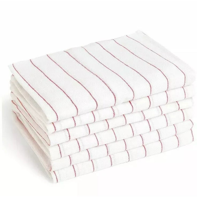 Commercial Grade • Towels especially designed to dry glasses without spots. They are thin and light, fast-drying and produce minimal lint. • Classic white towels with red stripes complement any kitchen decor. • Perfect addition for the "professional" chef in every family, these towels are similar to those used in many restaurant and hotel kitchens.